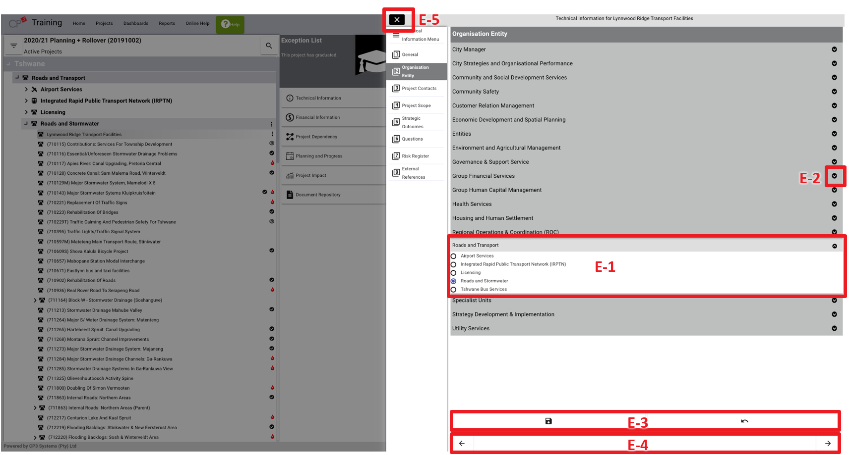 • (E-1) When the project is created on the project tree view, the organisation entity is automatically populated with the corresponding unit/department where the project was created. Users should verify whether the correct unit/department is selected.