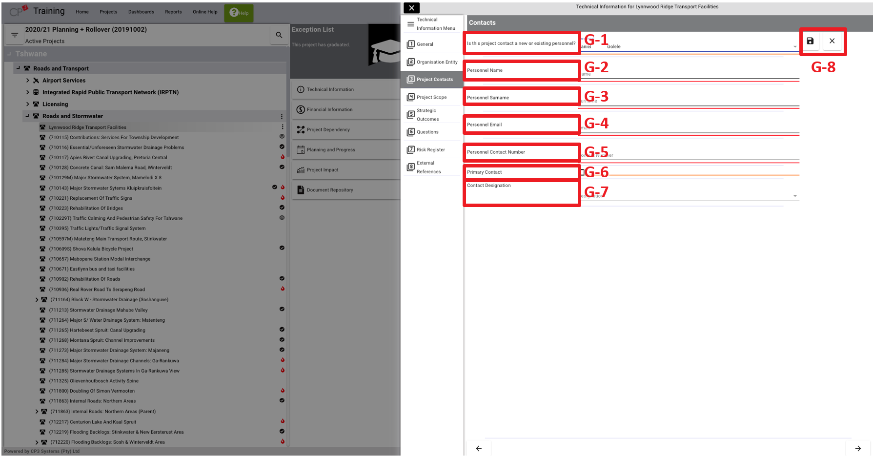 The third option listed on the project technical information window outlines the project contact information. To capture or edit project contact information, take note of the following: