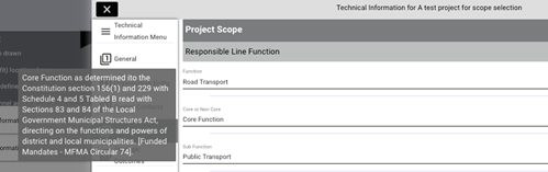 The fourth option listed on the project technical information window outlines the project scope information. The project scope information is based on the Municipal Standard Chart of Accounts (mSCOA) as regulated through National Treasury. For more information regarding mSCOA refer to: MFMA: Municipal Regulations mSCOA.