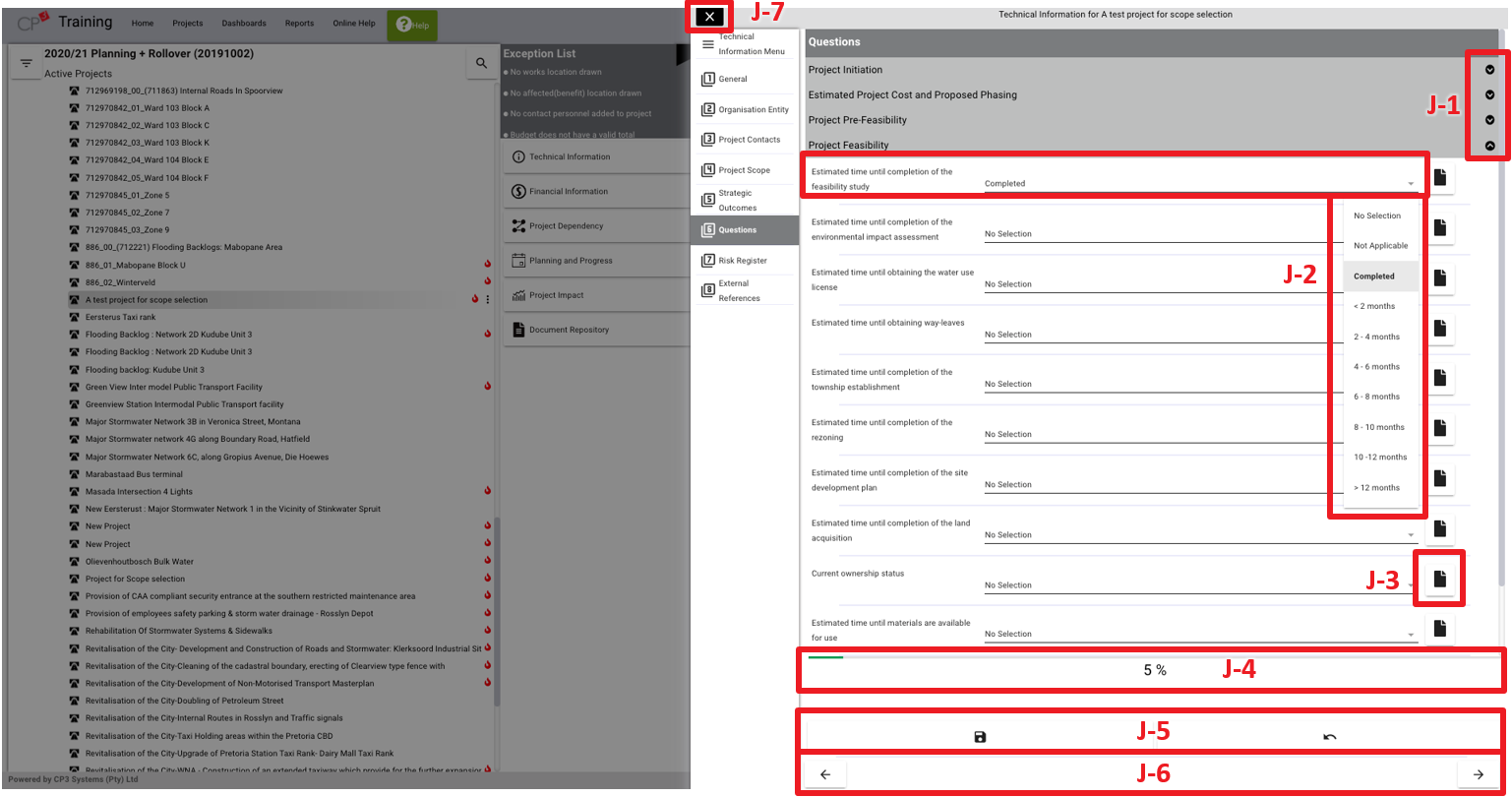 • (J-4) The % progress bar which outlines the completion rate of the project technical questions.
